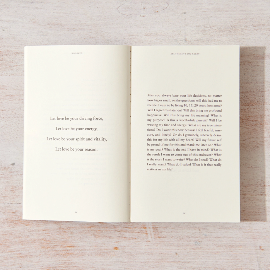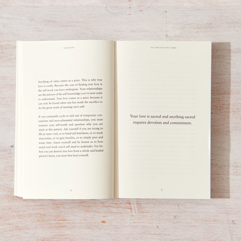 All The Love You Carry is a transformative collection of poetry and prose by Charis Ed, divided into three compelling sections that guide readers through the full spectrum of love's experience. This paperback explores how to cherish love when discovered, extract wisdom from heartbreak, and cultivate the resilience that emerges from self-compassion. Through lyrical language and introspective prose, the book illuminates love as the universe's most potent force—a creative power capable of reshaping both our inner worlds and our connections with others. Ideal for readers seeking deeper understanding of love's true essence and those embarking on personal healing journeys, this collection serves as a profound meditation on interconnectedness and the transformative art of loving ourselves and others.