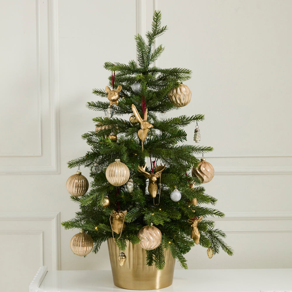 Add a touch of whimsy to your holiday décor with our Animals w/ Glasses Ornaments from the Eric & Eloise Collection. Each meticulously crafted from resin in bright gold, featuring a bespeckled fox, mustached hare, monocled moose, pipe-smoking buck, scarf wearing doe, and bowtied mouse. These delightful ornaments add a refined and friendly touch to any space.