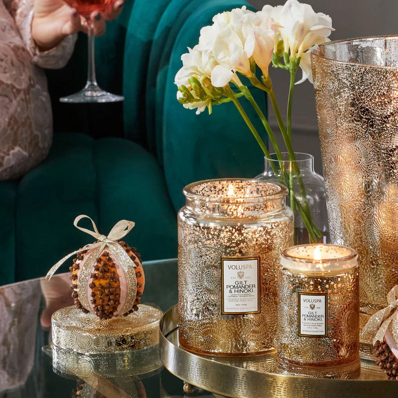 Experience the refined warmth of Gilt Pomander + Hinoki, a velvety blend that captures the golden spirit of the season. This sophisticated fragrance melds spiced cardamom, clove-studded citrus pomander, and holly berries with calming Japanese cedar wood, golden amber, and vanilla pods. Handcrafted in the USA with Voluspa’s clean-burning coconut wax and natural wicks, it offers a meditative ambiance free from phthalates, parabens, and sulfates. Perfect for inspiring tranquility or gifting luxuriously, this candle becomes a cherished keepsake long after the last burn.