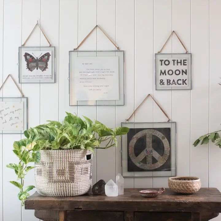 Elevate your home decor with our Glass + Metal Wall Hanging Picture Frame. Made with premium quality glass and adorned with a luxurious brown suede strap, this frame adds a rustic touch to your smaller Art Posters. Hang with ease and enhance the beauty with pressed botanicals or feathers. Art Poster not included.