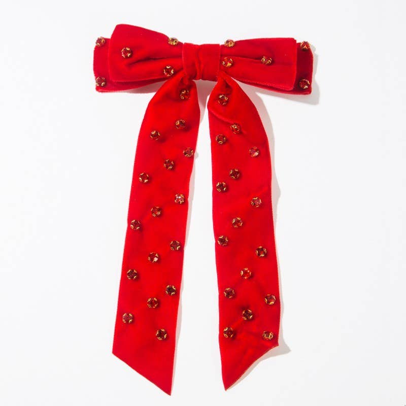 Sparkle and shine with these gorgeous Rhinestone Studded Bow Ribbon Hair Clips! Each clip features an enchanting bow design adorned with glittering rhinestones that catch the light beautifully. Whether you're dressing up for a special occasion or adding pizzazz to your everyday look, these clips deliver instant elegance and charm. The perfect size at 2" wide and 8" long, they're comfortable to wear and versatile enough to complement any hairstyle. Elevate your hair game with a touch of glamorous sparkle!