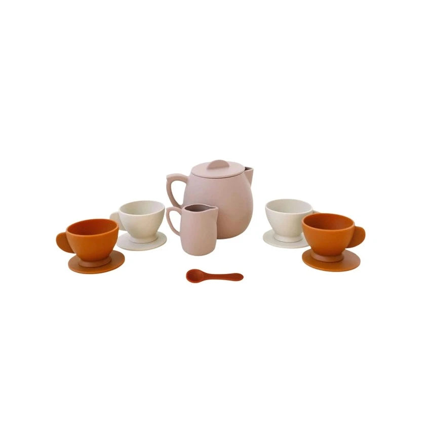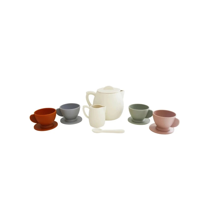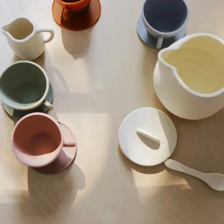 These Silicone tea sets are modern and timeless and are designed to spark imaginative play, develop social skills, and provide endless tea party fun! Our 12 piece tea sets are thoughtfully designed with love and care. They are available in classic neutral colors and are perfect for the modern family. They are perfect for tea parties, picnics, sensory or water play, and bath time! Made from 100% food grade silicone, they are BPA, phthalate free, and CPSC tested to ensure the highest quality and safety for your little one. Because they are made from silicone they will not crack or break over time like plastic. Our tea sets feature a tea pot and lid, four tea cups, four saucers, one cream pitcher, and one spoon.
