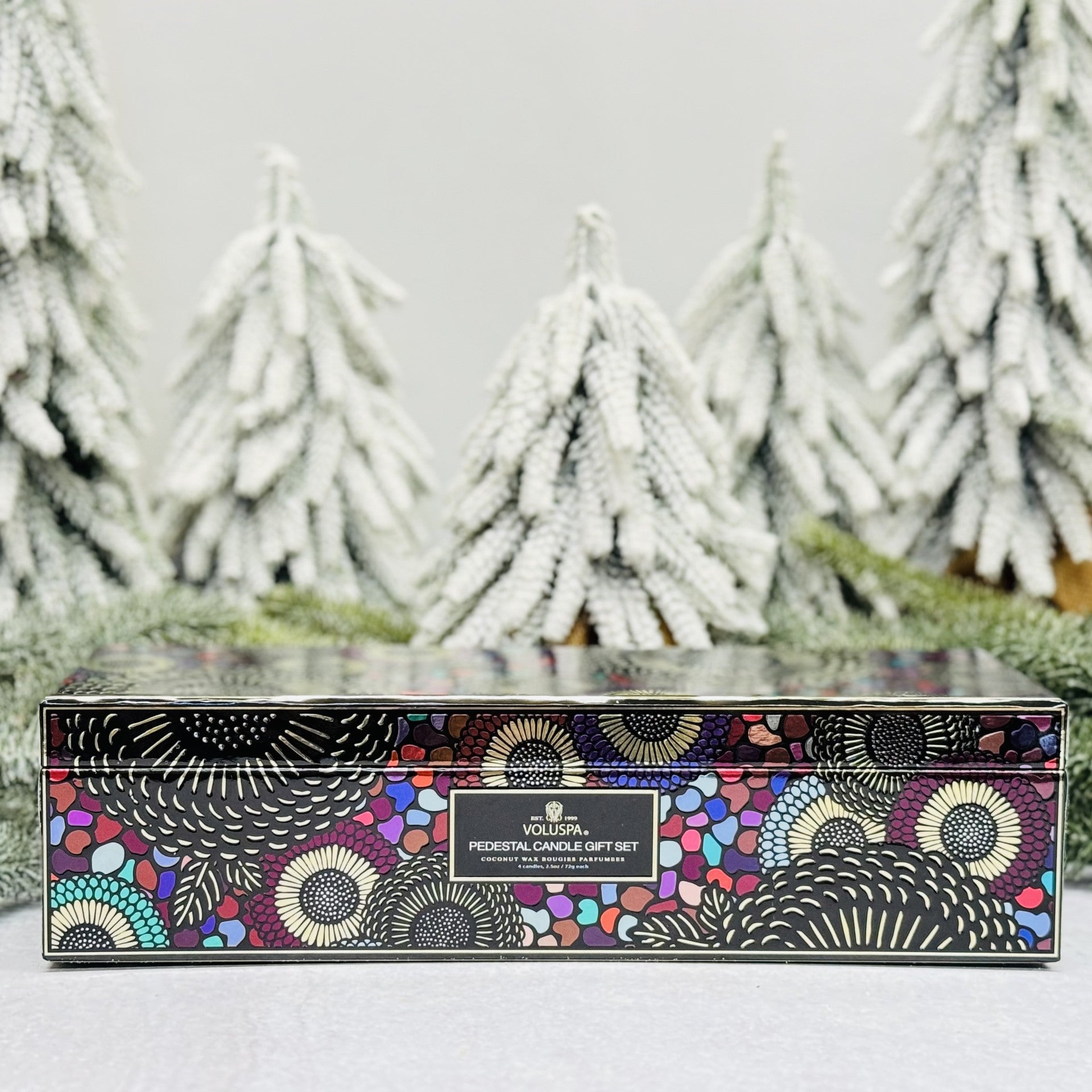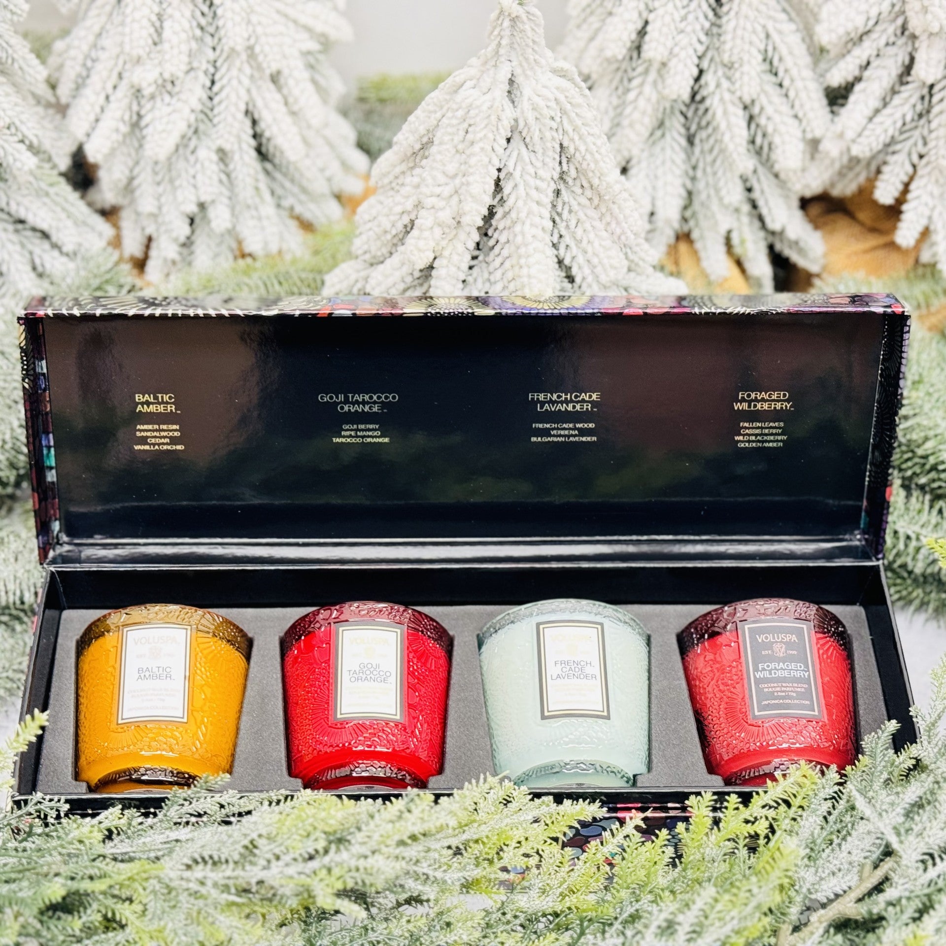 This 4-piece candle set features the best-selling fragrances in Voluspa's Japonica Collection. Fragrances Include: Baltic Amber, Goji Tarocco Orange, French Cade Lavender, and Foraged Wildberry. Each unique coconut wax blend is hand-poured into a 2.5 oz. glass vessel and burns for up to 25 hours. This luxe set makes the perfect gift for yourself or a loved one!